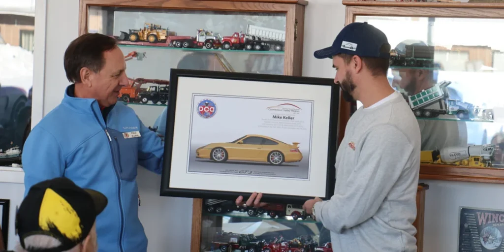 The highlight of the meeting (besides the pancakes) was the presentation of the Years of Service award to Mike Keller with some amazing artwork by CVRer Paul Kudra. You’ll recall that Mike ran the CVR concours for many years, along with other contributions. Congrats Mike, and thank you for your contribution to CVR over the years. We hope to see you back again in the future.